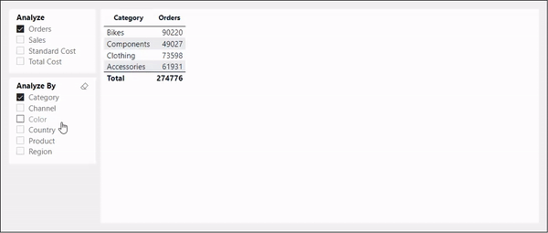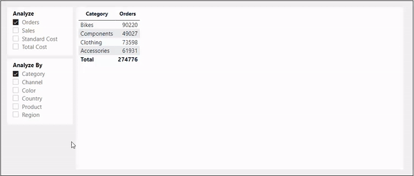 - Keep your dimensions and measures in separate parameters: it helps to keep things simple and separates the slicer values according to their usage. After all, it doesn’t make sense to show measures on a line chart’s x-axis or a dimension on the y-axis (neither is it allowed).