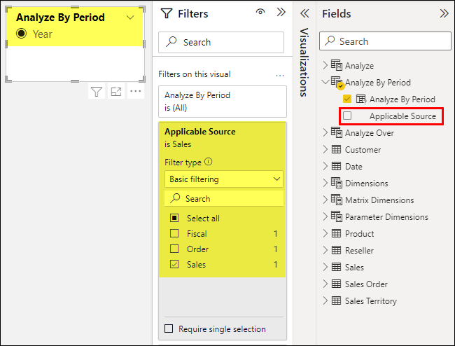 - Use the visual level filter to show only the relevant fields in the slicer: you can easily control the fields in the slicer by selecting the set of relevant values. The rest of the fields function as usual. Using the visual level filter helps keep the number of parameters minimum.