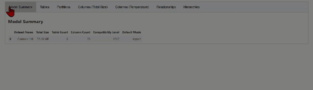 The model_memory_analyzer() function provides statistics from the VertiPaq Analyzer for the semantic model. In addition to the model size, it presents some important information, such as tables and their size statistics, partitions, segment counts, columns and their size statistics, relationships, hierarchies, and more.