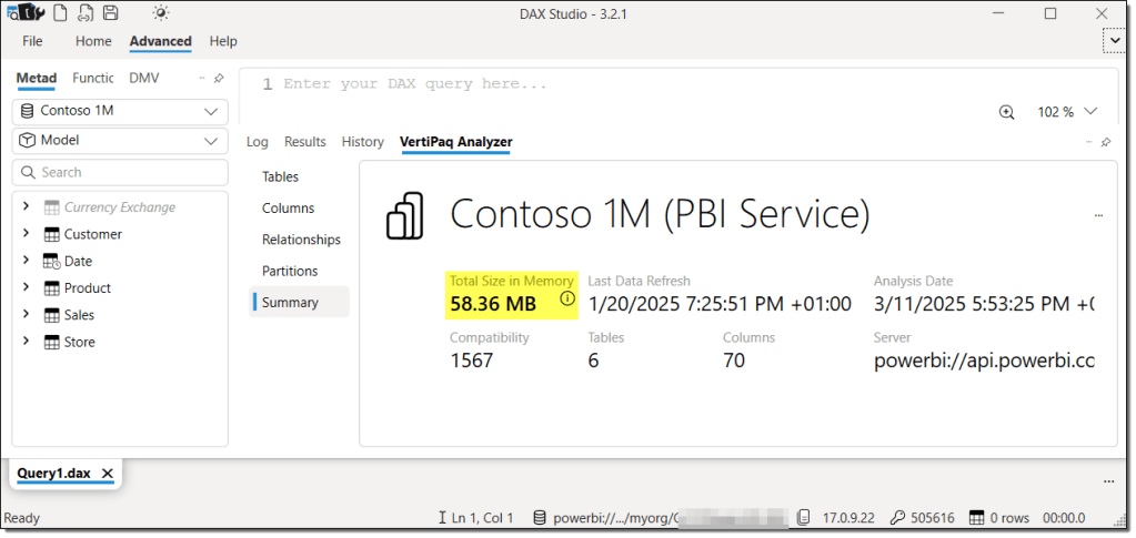 Traditionally, you could use external tools like SSMS, DAX Studio, Tabular Editor 3, and others to determine the memory size of a semantic model. Notice the size difference between SSMS and DAX Studio in the following images. This variation arises from the different methods these tools use to capture the size of the semantic model. However, the data is loaded into memory to measure its size in all cases.