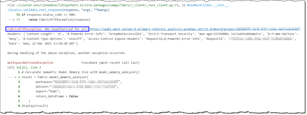 These error messages are related to the same issue and can be found in two different parts of the error log. You’ll see this error if you try to use SemPy in a workspace that isn’t accessible to you.