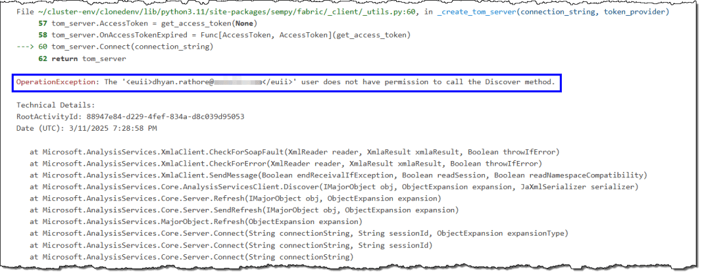 These error messages are related and appear in two sections of the error log. You will encounter this error if you try to use SemPy on a semantic model without Build permissions. You can find details about build permissions and how to obtain them for a semantic model here and here.