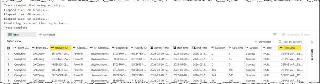 To capture DAX queries generated by user actions, we only need to trace the “QueryEnd” event with a handful of useful columns. The following code snippet defines the event schema for our trace and starts a trace on the target semantic model for 60 seconds. It captures all Query End events occurring in the target semantic model during those 60 seconds and returns the trace logs at the end.
