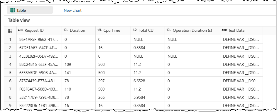 capacity_consumption_by_query = merged_df[['Request ID', 'Duration', 'Cpu Time', 'Total CU', 'Operation Duration (s)', 'Text Data']]