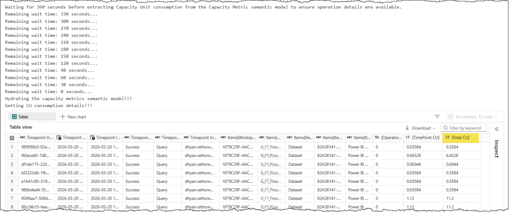 print(f"Waiting for {waitTime} seconds before extracting Capacity Unit consumption from the Capacity Metric semantic model to ensure operation details are available.")