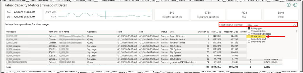 In summary, this means we don’t need an exact timestamp to retrieve CU consumption for an operation. As long as your TimePoint falls within that smoothing window, you’ll find the operation in the results. For example, if a DAX query’s CUs are smoothed over 5 minutes and the operation finished at 10:11:13, then you can find the CU details for this operation from TimePoint 10:11:31 until TimePoint 10:16:30.